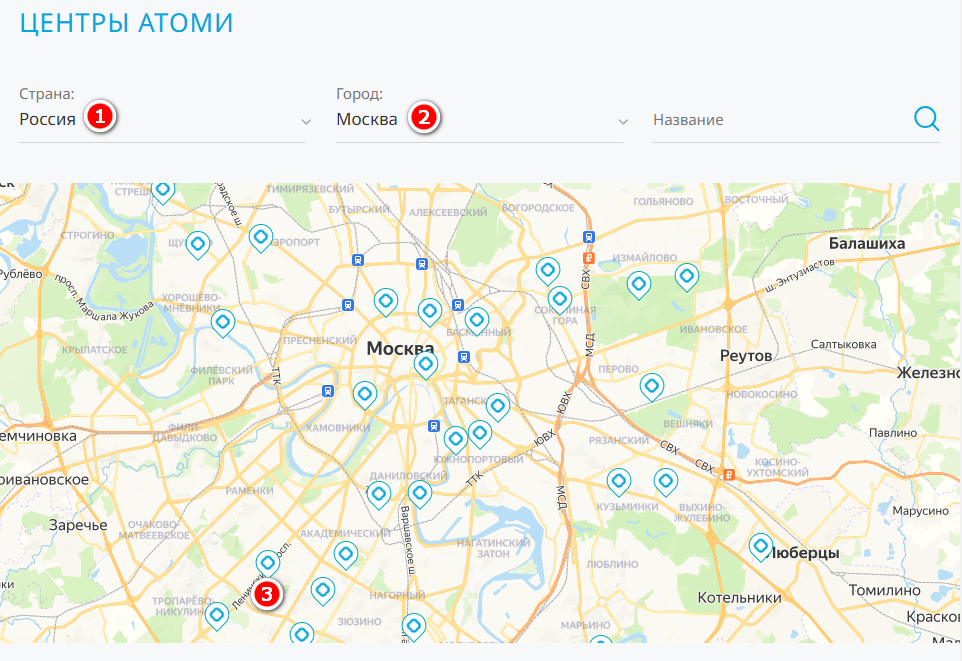 2. Введите название города в поле город или выберите из списка. Ниже будет выведен список центров Атоми для данного города 3. Чтобы найти на карте конкретный адрес, перейдите на Яндекс Карты https://yandex.ru/maps/ в другой вкладке браузера и введите в поиск адрес (город, улицу, дом) и нажмите Enter. 4. Вернитесь во вкладку с atomycenter.info и, сравнивая карты, выберите ближайший центр к найденному адресу и нажмите подробнее. Все центры отмечены на карте иконками