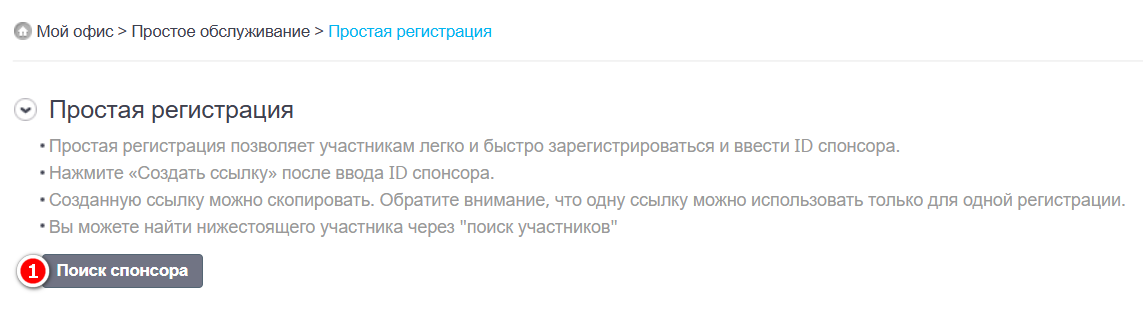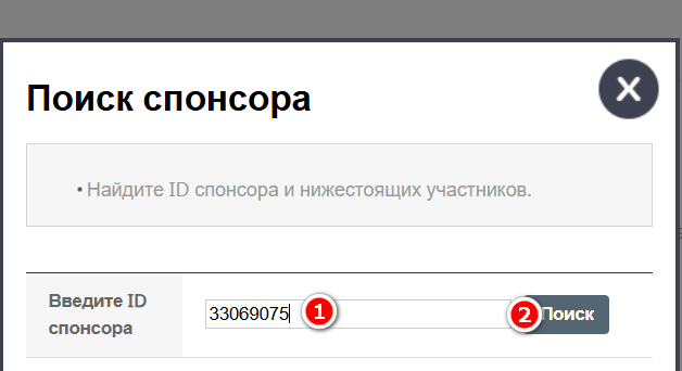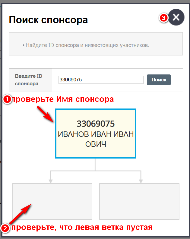 2. Нажмите "Поиск спонсора" 3. Введите ID спонсора под которого вы хотите регистрировать нового участника, определив его по инструкции Как выбрать ID спонсора при регистрации и нажмите "Поиск". 4. Проверьте имя спонсора и убедитесь, что его левая ветка свободна. Закройте поиск спосора, нажав на крестик.Создание ссылки