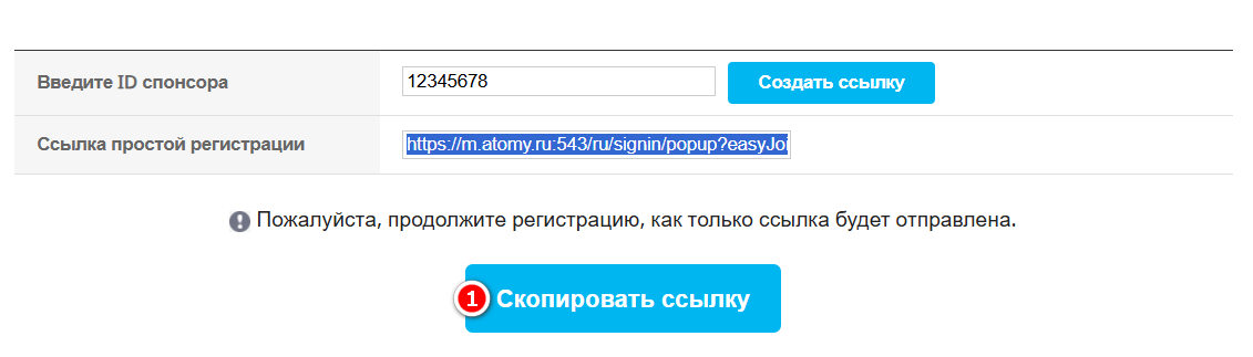 5. Снова введите ID спонсора 3. Подтвердите создание ссылки. 4. Скопируйте ссылку. 5. Подтвердите копирование ссылки. 6. Теперь вы можете вставить ссылку в любое поле ввода, нажав Ctrl+V и отправите её тому, кого хочет зарегистироваться.Все инструкции для компьютера
