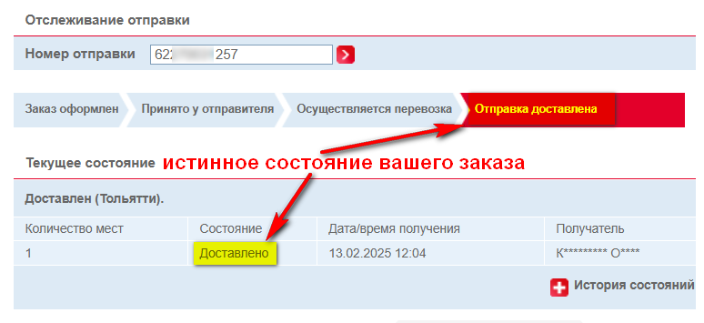 4. Вы перейдете на сайт транспортной компании. На нем будет отображено истинное состояние вашего заказа.