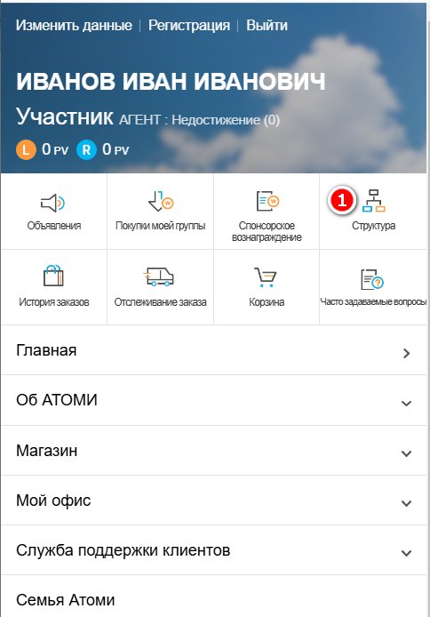 1. Войдите в профиль по инструкции Как войти в профиль Atomy. Войдите в меню и выберите "Структура".