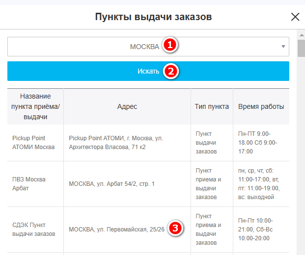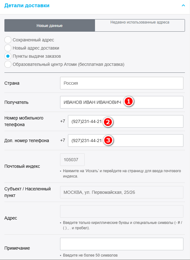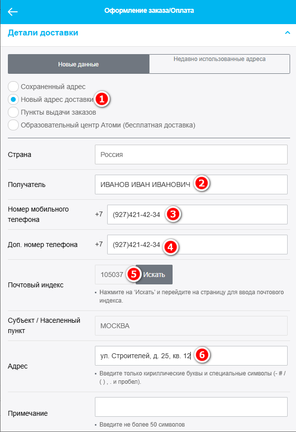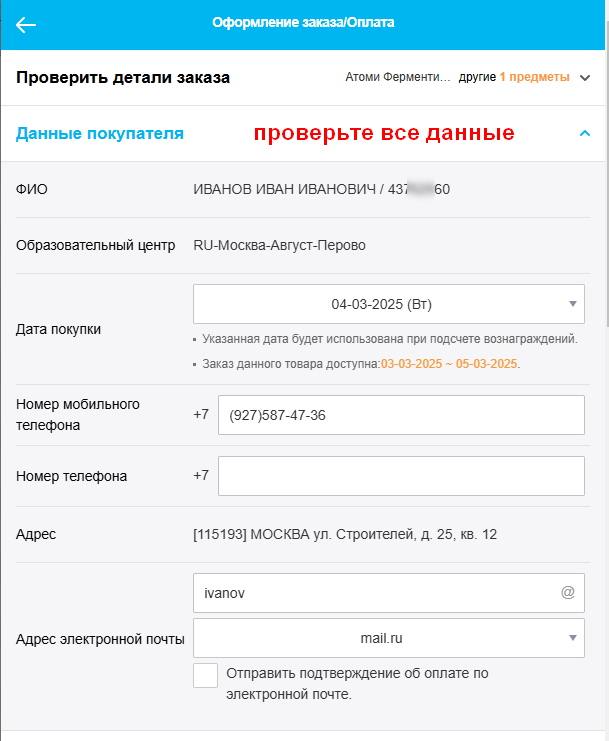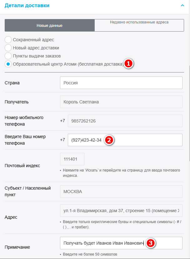 Доставка в центр Atomy всегда бесплатнаВыберите "Центр Atomy", введите Ваш номер телефона, в примечании укажите ФИО, кто будет получать. Поля адреса будут автоматически заполнены адресом выбранного Вами в профиле образовательного центра. Поверьте все данные и обратите внимание на стоимость доставки