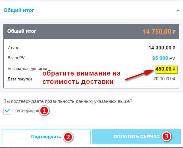 Выберите способ оплаты - СБП Пэй Выберите галочку "Подтверждаю" и нажмите "Подтвердить", подтвердите стоимость доставки, а затем "Оплатить сейчас" Отсканируйте QR-код в приложении вашего банка, подтвердите оплату и нажмите "Оплата завершена".Оплата банковской картой