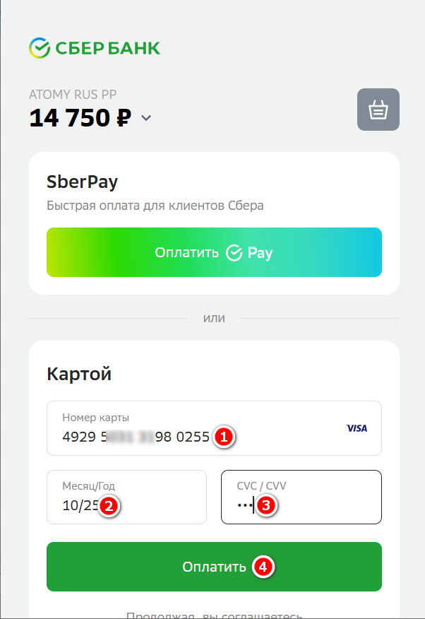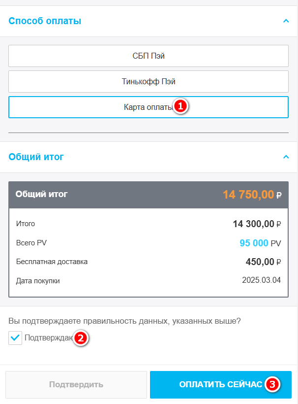 Выберите способ оплаты - Банковская карта Выберите галочку "Подтверждаю", нажмите "Подтвердить", подтвердите стоимость доставки и нажмите "Оплатить сейчас".Введите номер карты, срок действия и CVC/CVV и нажмите оплатить. Затем подтвердите платеж кодом из смс, если требуется. Далее вы попадёте на страницу, где будет подтвержден ваш заказ.