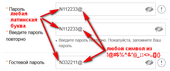в правой части полей ввода. Мы рекомендуем ставить пароль вида N112233@, где вместо N Вы можете написать любую латинскую букву, а вместо @ написать любой символ из следующих: !@#$%^&*()_;:<>,.[]{}. Введите гостевой пароль, который должен отличаться от основного пароля. Мы рекомендуем ставить гостевой пароль вида N332211@. Не бойтесь, даже если кто-то подберет ваш пароль, он не сможет вам навредить.