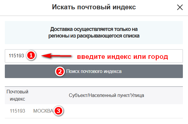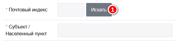 6. Нажмите кнопку "Искать" напротив "Почтовый индекс", затем введите почтовый индекс или город и нажмите "Искать", а затем "Выбрать". Если вы не знаете почтовый индекс, узнать его можно по иструкции Как узнать почтовый индекс по адресу.