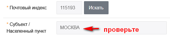 7. Проверьте, что населенный пункт задан правильно, иначе введите заново почтовый индекс.