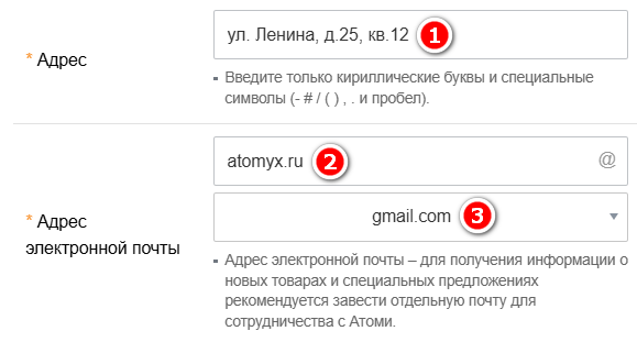 8. Введите адрес (улицу, номер дома, номер квартиры). По этому адресу вам будут доставлять посылки, если вы выберите курьерскую доставку.9. Введите адрес электронной почты. Если домен вашей почты осутствует в списке, отмеченном цифрой 3, нажмите кнопку ввести и введите домен электронной почты.