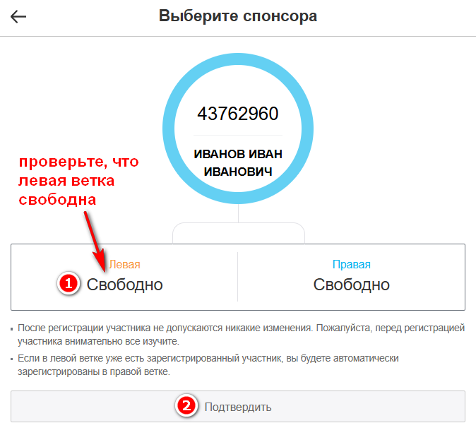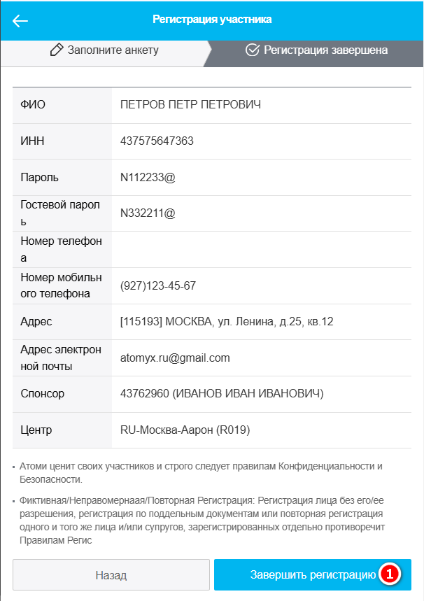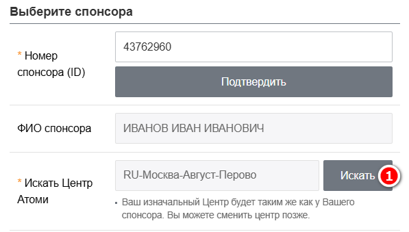 Если у Вас нет электронной почты, введите нашу почту atomyx.ru@gmail.com как на картинке. Подтверждать почту после регистрации не требуется. 10. Введите ID спонсора, полученный от того, кто Вас пригласил, и нажмите искать; проверьте, что его левая ветка свободна, и нажмите подтвердить. Выбор спонсора осуществляется по инструкции Как выбрать ID спонсора при регистрации. Если вы регистрируетесь по ссылке для регистрации, полученной от представителя atomy по инструкции Как создать ссылку для регистрации в Atomy, то поле спонсора будет уже заполненно и изменять его не нужно. 11. Выберите ближайший центр Атоми. Центр Атоми выполняет роль пункта выдачи заказов с бесплатной доставкой до него. Для поиска ближайшего центра Атоми следуйте инструкции Как найти ближайший центр Атоми. После регистрации Вы можете выбрать другой центр в любое время по инструкции Как изменить данные профиля 12 Проверьте все данные и нажмите "Завершить регистрацию". 13. Регистрация завершена. Сохранить в надежном месте номер пользователя (ID) и пароль. Теперь вы можете войти в профиль по инструкции Как войти в профиль Atomy